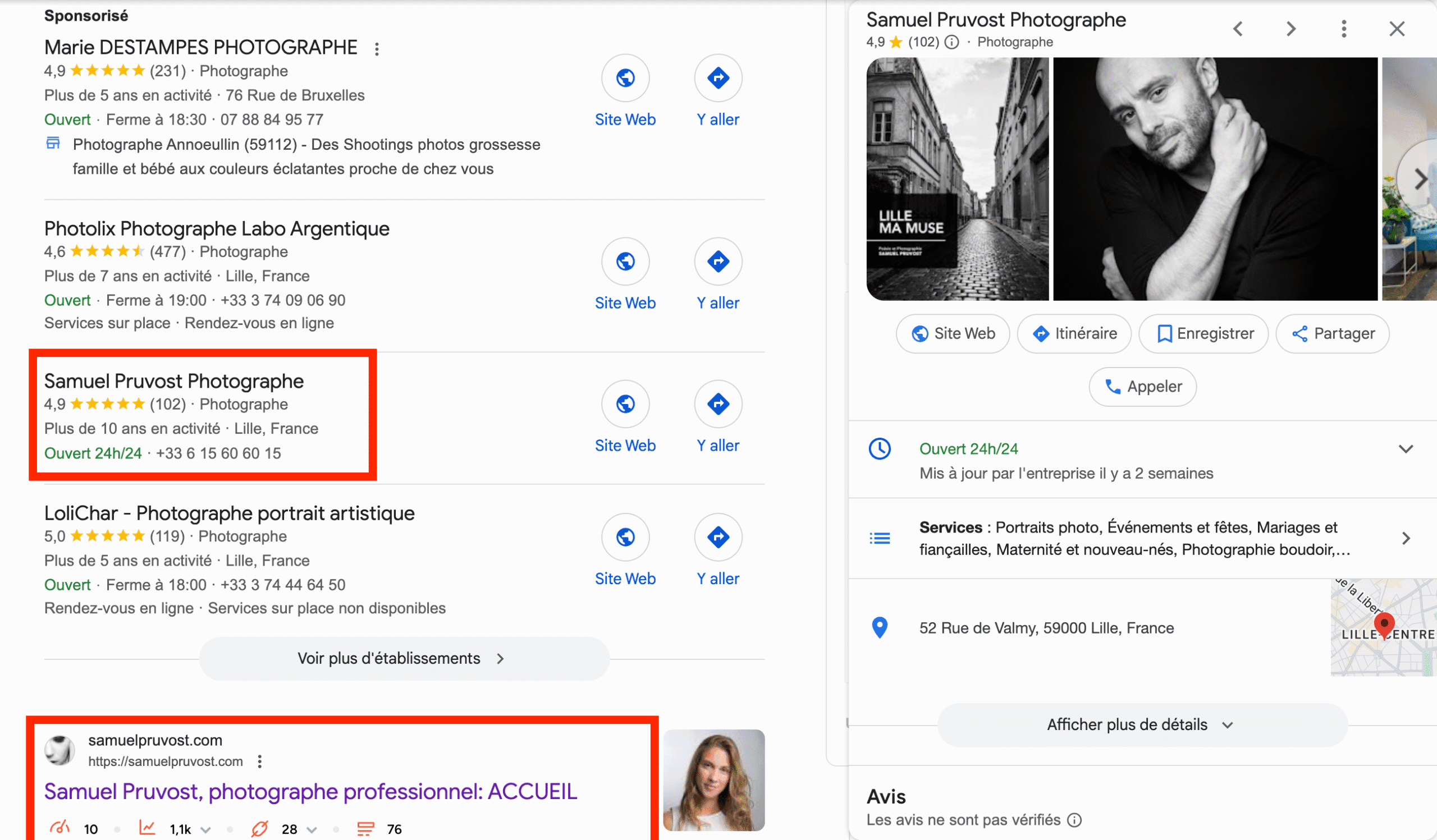 - Le SEO local → c’est ce qui permet à tes futurs clients proches de toi de te trouver. Il repose sur ta fiche Google Business Profile, tes avis clients et l’utilisation de mots-clés géographiques comme “photographe mariage Bordeaux” ou “shooting grossesse Lille”.